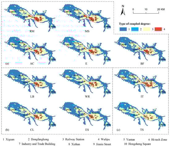 Coupling map of the different categories of service factors and the population density. Type (a) showed that the extreme coordination areas of service facilities and population density were concentrated mainly in Chengguan District, Qilihe District, and Xigu District. Type (b) had a smaller extreme coordination area than (a) and was mainly distributed in Chengguan District and Qilihe District. Type (c) showed that the extreme coordination areas of IT service facilities formed a point-like non-contiguous distribution in various counties, while TS services were mainly located in areas with good coordination.