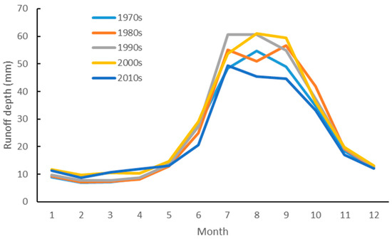 From 1970–2016, the overall trend in runoff is generally consistent across all years, with a slow increase from January to May and a sharp increase from May to a high in July. The runoff remains high from July until September, then drops sharply from September to December, with only the 2010s seeing a slow decline from July onwards. Overall, July to September is the high runoff period.