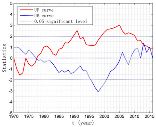 Based on the Mann–Kendall trend analysis method to analyze the mutation of the Jinsha River runoff from 1970 to 2016, the Mann–Kendall mutation test is generally considered to be reliable at the 0.05 level of significance in practical applications. When the two lines intersect and the intersection point falls within the 0.05 level of significance, the time of the intersection point is considered to be the time of the mutation of the time series data.
