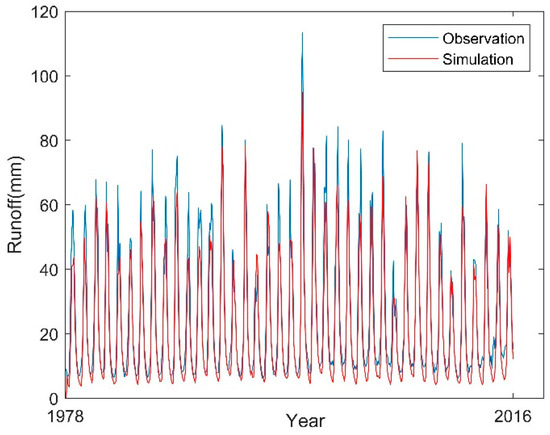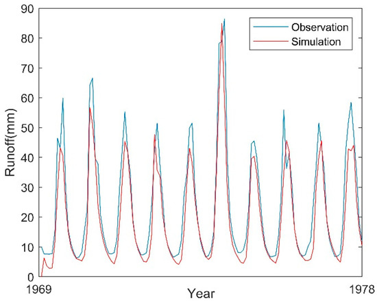 where and represents the runoff of two periods. The amount of runoff caused by climate change is the difference between the total runoff and the runoff caused by human activities. Equation (19) is as follows: