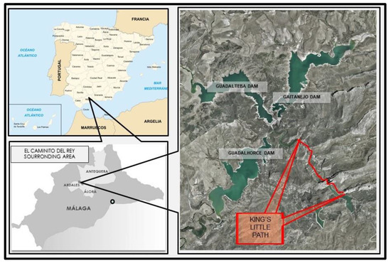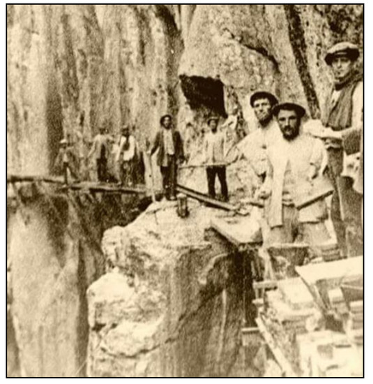 The so-called “El Caminito del Rey”, located in the Province of Málaga (South of Spain), is an infrastructure facility built at the beginning of the 20th century (Figure 1) that fell into disuse and became obsolete and useless. The path was built to facilitate the movement of personnel between the Gaitanejo dam and the hydroelectric power plant. In 1905, the work was completed and the path began to be used. However, it was not till 1921 that the official inauguration ceremony took place under the presidency of H.M. King Alfonso XIII (the current name of the site derives from this event).