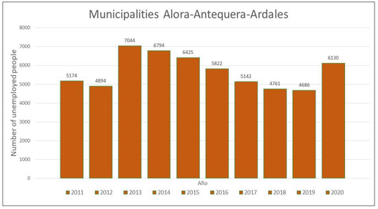 The positive impact is felt throughout the region as reflected in the official statistics of the State Employment Public Service [19]. The aggregated figures of unemployed people in the municipalities of the region (Álora, Antequera, and Ardales) and the corresponding trends are presented in Figure 4.