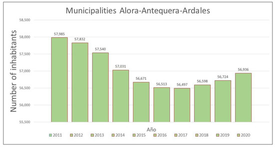 Official data from the National Statistics Institute [20] confirm this trend. The aggregate figures of inhabitants in the municipalities of the region (Álora, Antequera, and Ardales) are shown in Figure 5.