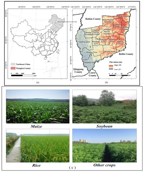 Description of the study area: (a) the geographical location of the study area and (b) the topography and administrative border of WangKui County. In addition, (c) represented the current status of crop types in the study area. (Images collected from Google Chrome on 26 July 2023).