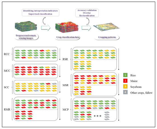 Processes of cropping pattern recognition. (RCC: Rice continuous cropping. Rice was planted at least three consecutive years within four years; MCC: Maize continuous cropping. Maize was planted at least three consecutive years within four years; SCC: Soybean continuous cropping. Soybeans were planted within four years for at least three consecutive years; RMR: Rice-maize rotation. Rice and maize were alternated in one plot over four years; RSR: Rice-soybean rotation. Rice and soybeans were planted in alternating fields over four years; MSR: Maize-soybean rotation. One plot alternated between maize and soybeans for four years; MCP: Mixed cropping pattern. Unregulated planting on a plot over four years.).