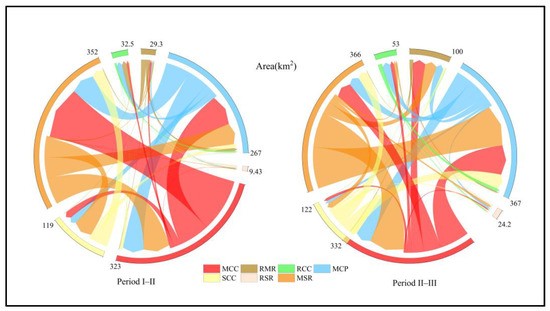 Chord diagram of cropping pattern transition matrix in Wangkui County during the period I–III.