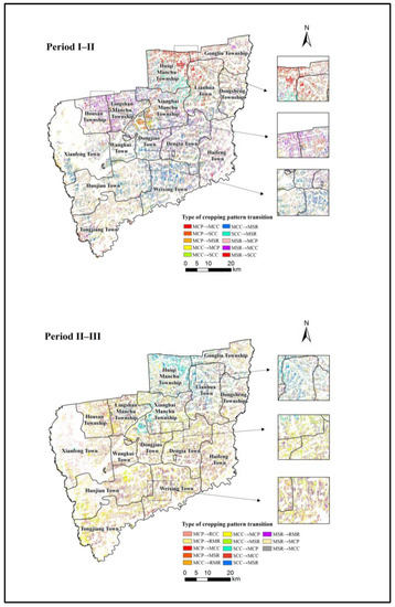 Overall variation in cropping patterns of Wangkui County (Periods I–II and III).