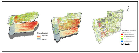 Furthermore, Du [24,25] utilized multi-temporal remote sensing images and geo-information Tupu methods to construct a comprehensive cropping pattern map. This study also involved analyzing the region’s spatio-temporal characteristics of cropping patterns. Both Nguyen [26] and Zhang [27] utilized MODIS EVI time series imagery to identify cropping patterns using multispectral remote sensing data and vegetation index time series. They successfully delineated single-season and double-season corn planting areas in Dak Lak Province, located in central Vietnam, as well as the primary types of cropping patterns in the North China Plain. In addition, Li et al. [28] also employed a comprehensive 10-year dataset of SPOT/VGT-NDVI time series data to examine the spatial patterns of typical cropping systems in the North China region. Current research on cropping patterns primarily focuses on remote sensing identification and spatial patterns, with limited attention given to the evolution of cropping patterns. However, studies on land use change have made significant progress in understanding the evolution of land classes, which can provide valuable insights for studying cropping pattern evolution. For instance, GIS space matrix and kernel density analysis were extensively employed to assess the spatiotemporal evolution characteristics of agricultural non-point source pollution [29]. In rural settlement evolution, the utilization of multi-period remote sensing interpretation data of land use and economic statistics enables the quantification of the historical and current conditions of rural settlement changes [30].