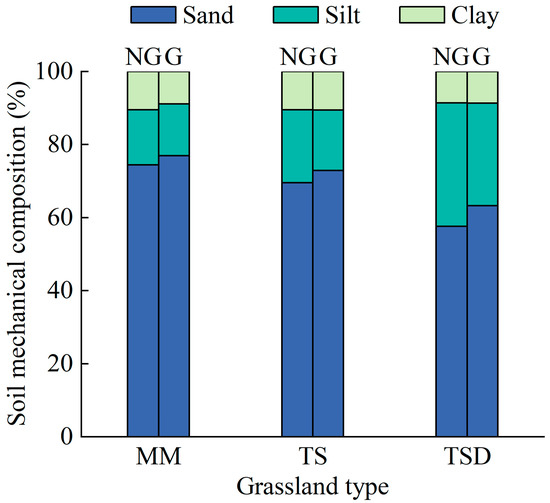 The experiment was conducted in MM, TS, and TSD grassland areas, each with a fenced grassland (non-grazing treatment, NG) plot and a neighboring grazing grassland (grazing treatment, G) plot. The grazing exclusion areas of the three grasslands were fenced for 8–10 years by the local government. Livestock grazing has been completely excluded from the fenced grasslands since the establishment of the fencing, while the area outside the fences has had continuous free grazing with sheep, goats, and cows from local herdsmen. MM, TS, and TSD are summer pastures, spring/autumn pastures, and winter pastures, respectively. Since the beginning of the 21st century, the grasslands in the Altay Prefecture, where the study area belongs, have been facing increasing levels of overloading. According to a local grassland inspection report, the number of livestock in the Altay Prefecture reached 4.28 million in 2012, resulting in an overload rate of 75% [30]. Moreover, the grazing pressure on summer pastures was particularly high due to the scarcity of grass in spring/autumn pastures and winter pastures. The details of the sampling plots are shown in Table 1. The soil type, soil texture, and plant species composition were found to be similar both inside and outside the fence at each site. As shown in Figure 1, the sand, silt, and clay contents of the soil in both the fenced grassland and grazing grassland of each site were similar.