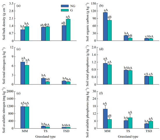 Responses of soil physical and chemical properties to grazing in different grassland types: (a) soil bulk density, (b) soil organic carbon, (c) soil total nitrogen, (d) soil total phosphorus, (e) soil available nitrogen, and (f) soil available phosphorus. Note: NG, non-grazing treatment; G, grazing treatment; MM, mountain meadow; TS, temperate steppe; TSD, temperate steppe desert. Different lowercase letters indicate significant differences (p < 0.05) between different grassland types, and different uppercase letters indicate significant differences (p < 0.05) between grazing and non-grazing treatments.