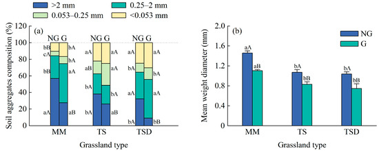Responses of the composition and stability of soil aggregates to grazing: (a) soil aggregates composition, and (b) mean weight diameter. Note: NG, non-grazing treatment; G, grazing treatment; MM, mountain meadow; TS, temperate steppe; TSD, temperate steppe desert. Different lowercase letters indicate significant differences (p < 0.05) between different grassland types, and different uppercase letters indicate significant differences (p < 0.05) between grazing and non-grazing treatments.