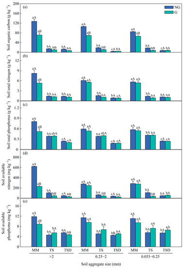 Responses of soil nutrients in aggregates to grazing: (a) soil organic carbon, (b) soil total nitrogen, (c) soil total phosphorus, (d) soil available nitrogen, and (e) soil available phosphorus. Note: NG, non-grazing; G, grazing; MM, mountain meadow; TS, temperate desert steppe; TSD, temperate steppe desert. Different lowercase letters indicate significant differences (p < 0.05) between different grassland types, and different uppercase letters indicate significant differences (p < 0.05) between grazing and non-grazing treatments.