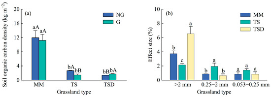 Organic carbon density in the soil layer of 0–10 cm (a) and grazing effect size on aggregate-associated SOC varied in different sizes of soil aggregates (b). Note: NG, non-grazing; G, grazing; MM, mountain meadow; TS, temperate steppe; TSD, temperate steppe desert. Different lowercase letters indicate significant differences (p < 0.05) between different grassland types, and different uppercase letters indicate significant differences (p < 0.05) between grazing and non-grazing treatments.