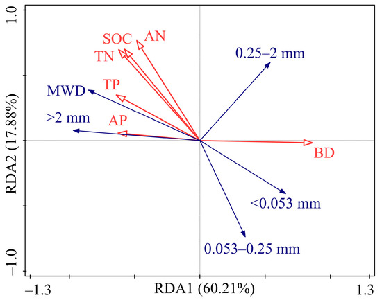 Redundancy analysis (RDA) for relationships between characteristics of soil aggregates and properties of bulk soil. BD, soil bulk density; SOC, soil organic carbon; TN, soil total nitrogen; TP, soil total phosphorus; AN, soil available nitrogen; AP, soil available phosphorus; MWD, mean weight diameter.