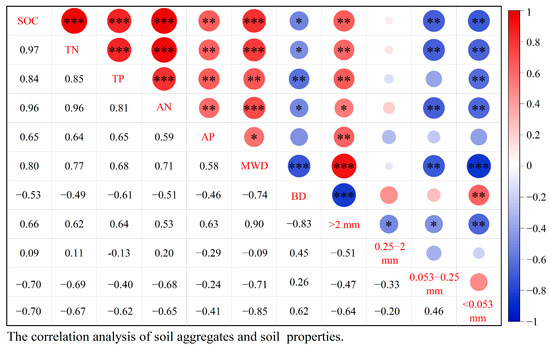 Correlation analysis of aggregate characteristics and soil properties. Note: SOC, soil organic carbon; TN, soil total nitrogen; TP, soil total phosphorus; AN, soil available nitrogen; AP, soil available phosphorus; BD, soil bulk density. *, **, and *** indicate significant differences at p < 0.05, p < 0.01, and p < 0.001, respectively.