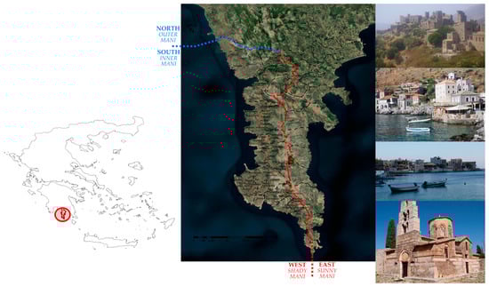 The region of Mani extends in an area of a total of 995.1 km2 on both sides of Taygetos Mountain and it is located in the southernmost and middle peninsula of the Peloponnese, including parts of the regional unities of Lakonia and Messinia. An imaginary line running almost east–west divides the region into the North or Outer Mani and the South or Inner Mani. Inner Mani is distinguished by the longitudinal ridge of Taygetos in the East or Sunny and the West or Shady Mani [29] (Figure 1). Historically, the area presents an unbroken sequence stretching from prehistoric times to the present day, which generated not only numerous monuments, traditional settlements, and interesting land formations, but also unique examples of traditional and intangible heritage. The area was an important core of political developments during the Greek Revolution of 1821 and in the creation of the newly established Greek state. Eastern Mani’s landscape is characterized by its pre-eminently fierce aspect, the paucity of low vegetation, and the dominating presence of stone. The preservation of Mani’s peninsula is subjected to Greek legislation on the protection of cultural and natural heritage, under EU directives. In addition, the promotion and protection of the area’s unique features is included in Greek national spatial policy with the elaboration of national and regional spatial development planning.