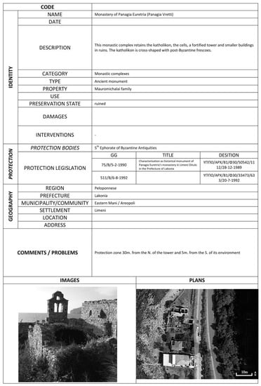 The data obtained during investigation process was recorded and classified in documentation data sheets (DDSs). DDSs were completed for each cultural and natural component of the landscape: monuments, archaeological and historical sites, settlements, existing hiking trails, museums, interesting buildings, and natural resources—that is, tangible heritage assets. The DDS structure was based on the indicators and domains defined in the QMGT and the category of interest. In general, information was classified into fields for the identification of the element, its typology/category based on the QMGT terminology, and protection framework and location, accompanied by a field for additional observations and/or problems. In the first field, a unique code was noted for the identification of each recorded subject. Taking a monument as an example, the fields of interest in the corresponding data sheet referred to (a) the name, date of origin, description, declaration type, property, use, preservation state, decay, and interventions for its identification; (b) the protection bodies, decision code, and title and description for the description of its protection framework; (c) the region, municipality, settlement, position, and address to define the monument’s location; and (d) spatial or historical data to determine relationships among the different elements of the CL. Other than descriptive data, spatial and raster data were also recorded in the DDSs: the exact location of each element and detailed photographic documentation were recorded in special fields at the end of each DDS (Figure 4 and Figure 5).