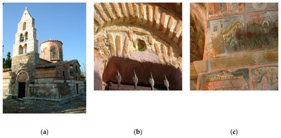 Detailed photographic documentation of the church of Taxiarches in Charouda: (a) perspective view of the monument, (b) exterior decoration, and (c) interior decoration.