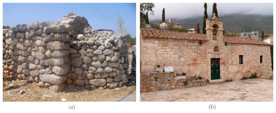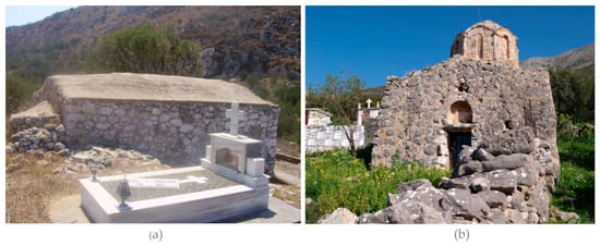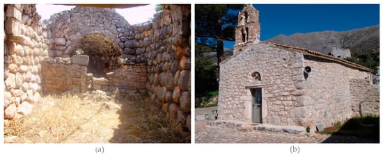 (a) The church of Agioi Asomatoi in Keria settlement as a typical example of a barrel-vaulted single-naved type church with megalithic masonry, and (b) the church of Agios Georgios (Stefanopoulianon) in Itilo as a typical example of a barrel-vaulted single-naved type church with rubble masonry.