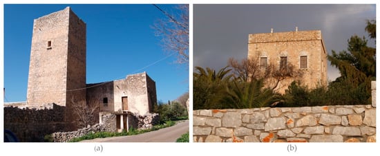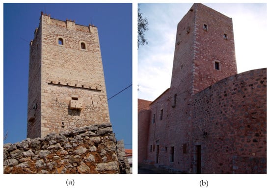 Two representative fortified facilities in Eastern Mani: (a) Mparelakos Tower in Areopolis, and (b) Arapakis Tower in Charia. The typology and morphology of the towers follow the dictates of their use and fortified character: the floor plan is of limited area, almost square, with a height that gradually increases, whereas the elevations are simple with small openings (especially on the highest floors). The construction resulted in a single-pitched or two-pitched roof, while the lowest level was roofed with a stone-built arch. The communication between the floors was through a trapdoor. The house building followed tower construction within common axis.