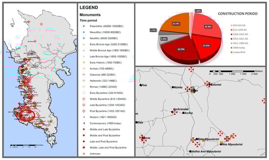 The recording of TCH and the rich traditions in the study area during the investigation process set the conditions and provided the corresponding data for tangible and intangible cultural heritage classification, assessment, and correlation, in order to develop a strategic plan for the sustainable development of the region under study. As mentioned in the Methodology section, a geographic information system (GIS) was used as a tool for the management and analysis of data recorded and classified in DDSs. The system’s attribute data consisted of the relational databases. The database structure followed the fields of the DDSs and the terms, directions, and instructions of the QMGT. Spatial data consisted of the base maps created from digitizing historic and spatial information: the digitized points of interest (monuments, etc.) were added to the base map and they were subsequently linked to the corresponding descriptive data on the databases, based on the unique code on the DDS. As a result, thematic maps of the current state were elaborated per element of interest and per different type, field, and subfield of the unified database, or in combination. The management and analysis procedures in GIS followed the two working planes of the proposed methodology: at the regional level, thematic maps presented the points of interest in relation to the wider area under investigation, whereas, at the more detailed level, the points of interest were presented in relation to the settlement in which they are located.