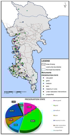 Overlapping procedures between the thematic maps of the main categories and the preservation state of the monuments, it emerged that the majority of the churches are maintained in good (67 monuments) and very good (18 monuments) condition, which is a total of 54.84% of the churches, compared to 22.58% where their masonry is in ruins and 7.74% where they are in a poor preservation state. The results for the preservation state of the fortified buildings seem to be more evenly distributed, as, of the total of the 25 records, 5 are in very good condition after restoration interventions, 7 in good condition, 3 in moderate condition, 4 in bad condition, and 5 were considered to be in ruins, while 1 was under restoration interventions. The fortified complexes present similar results: of the 15 in total, 6 were considered to be in very good condition, 2 in good condition, 6 in ruins, while one was under restoration interventions. These results are mainly affected by the ownership status of the monuments: most of the ecclesiastical buildings are public, whereas, on the contrary, the restoration of the fortified buildings is subject to private initiative.