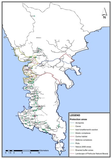 An initial unified thematic map for the preservation of the current state of the study area is elaborated, merging all the monuments (points), museums (points), settlements (points), protection areas (polygonal), and hiking routes (linear), the wider road network (linear), as well as the administrative local units (polygonal), which are included in the wider administrative and coastal national boundaries. This map serves as the base map for the specific current state maps, with reference to a specific reference field.
