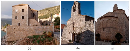 The majority of the buildings in the first category (religious buildings) are simple structured, small-scaled churches scattered in Eastern Mani’s landscape (Figure 9). A total of 131 churches, that is, 78.92% of the ecclesiastical buildings, belong to the type of barrel-vaulted single-naved church with several variations: double-apsed, triple-apsed, domed, with megalithic masonry, or with rubble masonry. The prevailing construction of the barrel-vaulted single-naved type is rubble masonry churches, followed by megalithic masonry churches (Figure 10). These single-naved churches built with large stones without mortar constitute, according to Bouras [35], the indigenous type of Mani’s ecclesiastical architecture, and date from the Early Byzantine period. Another type of church that is often found is the domed cross-in-square type. In total, 22 churches of this type are presented in the thematic map of the current state showing the architectural type of the monuments, of which 12 were two-columned, 4 four-columned, and 1 single-naved. The remaining records of monuments of religious character include 1 cross-in-square contracted type church, 2 cross-vaulted type churches, 3 three-naved basilica type churches, and a total of 3 churches of free cross-plan, of which 2 are domed and 1 with a raised central bay in a transverse barrel vault acting as a dome. The total number of entries in the category of ecclesiastical buildings also include the number of churches whose architectural type could not be identified due to their state of preservation.