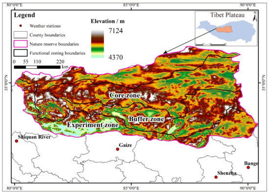 The nature reserve is divided into the core zone, buffer zone, and experimental zone. The core zone of a nature reserve refers to the concentrated distribution area of well-preserved natural ecosystems and rare and endangered flora and fauna, where entry is strictly prohibited for any organization or individual. The buffer zone is designated for scientific research and observation activities only. The experimental zone allows access to scientific experiments, educational internships, visits and inspections, tourism, as well as activities related to the domestication and breeding of rare and endangered wildlife. With an area of approximately 298,000 km2, it is the largest nature reserve in China and the second-largest continental nature reserve globally, following Greenland National Park. Moreover, it holds the distinction of being the highest nature reserve in terms of average altitude (Figure 2).