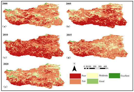 To further investigate the changes in the local ecological conditions, the normalized RSEI ecological index was divided into five levels according to the 0.2 value interval, from low to high; excellent: 0.8–1.0; good: 0.6–0.8; moderate: 0.4–0.6; fair: 0.2–0.4; poor: 0–0.2.