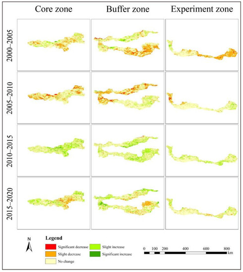 Table 3 illustrates that from 2000 to 2010, the overall ecological environment in the reserve exhibited a declining trend. Specifically, the proportion of areas classified as fair and poor increased by 51.99%, while the proportion of areas classified as good and excellent decreased by 32.69%. However, from 2010 to 2020, the overall ecological environment in the reserve displayed an upward trend. During this period, the proportion of areas classified as good and excellent increased by 6.11%, while the proportion of areas classified as fair and poor decreased by 2.91%. Examining the three distinct functional zones, Figure 5 demonstrates that the ecological environment in the core zone consistently surpassed that of the buffer and experiment zones. The core zone exhibited minimal changes in the ecological environment and was nearly devoid of the poor level. From 2005 to 2010, there was a slight decrease in the ecological environment, followed by a slight increase from 2010 to 2015. The ecological environment in the buffer zone exhibited regional variation. Between 2000 and 2005, the southern part of the buffer zone experienced a more pronounced deterioration compared to the northern part. However, from 2005 to 2010, the ecological environment in the northern part showed a more significant decline than in the southern part, while the overall ecological environment improved from 2010 to 2015. The areas classified as poor in terms of RSEI level were primarily concentrated in the experiment zone, which displayed considerable variation in ecological conditions. From 2000 to 2005, there was a slight decrease in the ecological environment in the eastern part of the experiment zone, while from 2005 to 2010, there was a slight decrease in the western part and a slight increase in the eastern part. Overall, the ecological environment improved from 2010 to 2015.