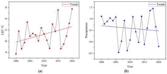 Land surface temperature and SPEI of the study area in 2000–2020. (a) Land surface temperature of the study area in 2000–2020. (b) The SPEI of the study area in 2000–2020.