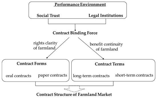 The effect mechanism of performance environment and contract binding force on the contract structure of farmland transfer market.