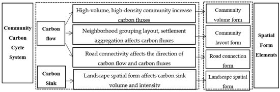 The influence of spatial form on carbon emissions occurs mainly through the influence of the spatial form on human activity and behavior, acting indirectly on carbon emissions. The influence process of spatial form elements on carbon emissions can be summarized in the following aspects, as shown in Figure 1.