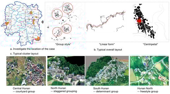 Hunan Province is located in the central part of China, which includes a variety of natural terrain conditions, such as plains, hills, and mountains. However, since most of the suburban integrated villages are close to cities and the settlement locations are relatively flat, this study only focuses on the relationship between the spatial forms of rural communities and carbon emissions in the plain terrain. Through the investigation of suburban integrated villages in different areas of Hunan, we find that the villages in Northern Hunan have the form of large, scattered, and small clusters; Western Hunan has a linear layout, and Southern Hunan has a centripetal layout of traditional villages, as shown in Figure 3. The spatial forms of neighborhood building groups mainly include row, staggered, diagonal, and free styles.