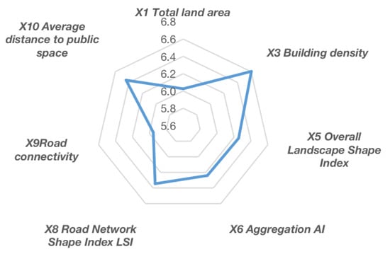 X1 is the total land area of the rural community and X2 is the area of built-up land in the countryside, both of which can be obtained from the rural land area data. X3 or building density is the ratio of the built-up area to the total area of the community. X4 is the perimeter area fractional dimension index, where values between 1 and 2, or greater than 1, mean that it has deviated from a simple geometry; the higher the value, the more complex the shape. X5 is the overall landscape shape index, which is a simple description of the degree of morphological aggregation; the larger the value, the more irregular it is. If it is equal to 1, it is closer to a square, becoming progressively larger as the patch type becomes more discrete, and the smaller the value, the more aggregated it is. X6 is an indicator of aggregation (AI). AI is equal to 0 when settlements are most fragmented, and it is equal to 100 when they are clustered together as a whole. X7 is the connectivity index (CONNECT); when there is no connection between patches, the connectivity is 0, and when the patch is connected to every other patch, the connectivity is 100. X8 is the road network shape index (RNSI), which is a measure of the degree of aggregation and disaggregation of the landscape. If it is equal to 1, it is a square; the larger the value, the more irregular it is, and the smaller the value, the more regular and compact it is. X9 is the road patch proximity index (CONTIG), reflecting the connectivity or proximity of rasters within road landscape patches, with better connectivity reflected by values closer to 1. X10 is the average distance to public space for each village group.