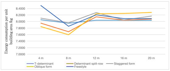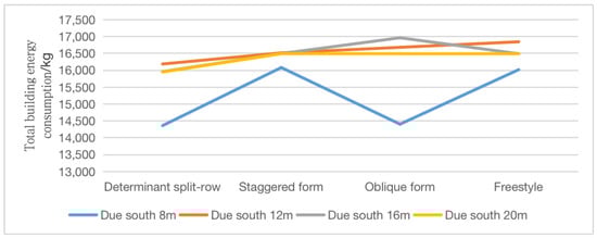 The typical building layout form is selected in Table 16 below, and the magnitude of the aggregation degree is changed by adjusting the building spacing; the energy consumption simulation results are shown in Figure 11. It can be seen that the higher the degree of aggregation, the more obvious the effect of the layout form of the neighborhood building group on the energy consumption of the building. In the range of 8–12 m, the carbon emissions of the building increase as the degree of aggregation decreases. When the main distance between buildings reaches 12 m or more, the influence of different building layouts on the buildings diminishes. Among the different layout forms, the energy consumption of the row and diagonal layout is the lowest in the case of a positive southern orientation and 8 m primary and secondary building spacing, as shown in Figure 12.