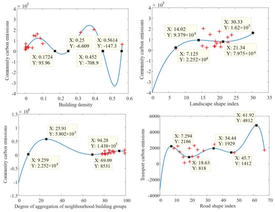 After clarifying that three spatial morphological indicators, namely the building density and the overall landscape shape index at the community level, and the aggregation of neighborhood building groups at the mesoscopic level, are important influencing factors for carbon emissions in rural communities, and the road shape index and the accessibility of public space are important influencing factors for transport carbon emissions, regression fitting is carried out based on the existing data, and the results are shown in Figure 13 below.