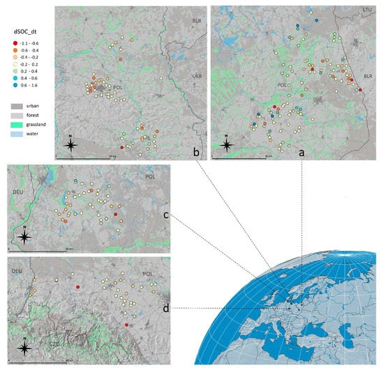 Localizations of measurement points and means of soil organic carbon stock change rate dSOC_dt from two periods in regions: a—Podlaskie, b—Lubelskie, c—Zachodniopomorskie and d—Dolnoslaskie.