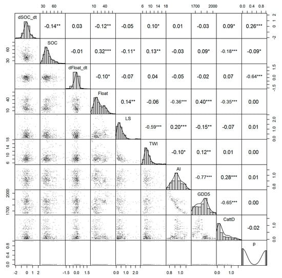 Efforts were made to select explanatory variables that are not obviously causally related, which is largely confirmed by the correlation analysis. The Spearman correlations between the variables in the model are usually low (Figure 2), although, in the case of pairs LS-TWI, AI-GDD5, GDD5-CattD, and dFloat_dt-p, they exceed the level of 0.5.