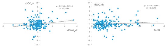 A change in SOC may also occur because we did not reach the point of the previous measurement. In this case, not only will the SOC change, but also other soil parameters, including soil particle size distribution. As soil texture is almost constant over time, the expression dFloat_dt with a change in the fraction of soil floatable particles was added to the model Equation (2) as a measure of not hitting the same measurement point. In Polish soils, a floatable fraction is easier to measure (due to a higher share and wider range of variation) than the clay fraction. It should be noted that erosion may also result in the leaching of the floatable fraction and the simultaneous loss of organic carbon in the soil. Therefore, special attention will be required when interpreting the results of the model term with the floatable fraction change rate.