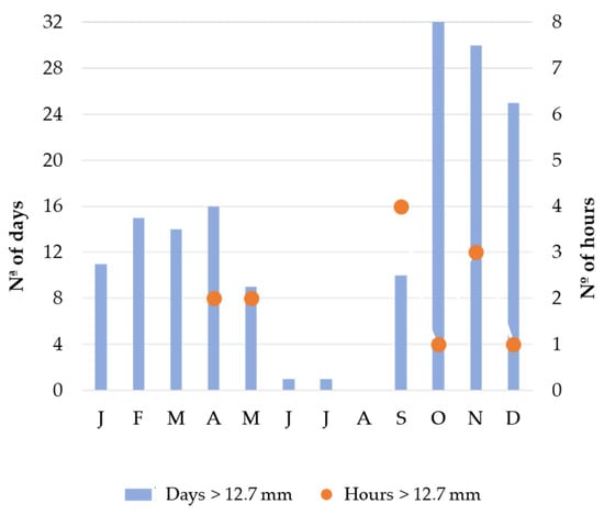 This variability reflects the seasonal pattern typical of the Mediterranean region, with rainfall concentrated in the autumn and winter months. Considering the 12.7 mm threshold proposed by Renard et al. [69] to define precipitation events that have erosive power, daily and hourly precipitation were analyzed for the study area for the period 2002–2020. As we can see in Figure 2, most of the daily erosive rainfall occurred in October and November, with a record around 30 days with more than 12.7 mm of rainfall for the period under analysis. Although there were not a significant number of days in September when precipitation exceeded 12.7 mm, when precipitation did occur in this month, there was a high probability that it would be concentrated in a short period of time (1 h) compared to the other months of the year.