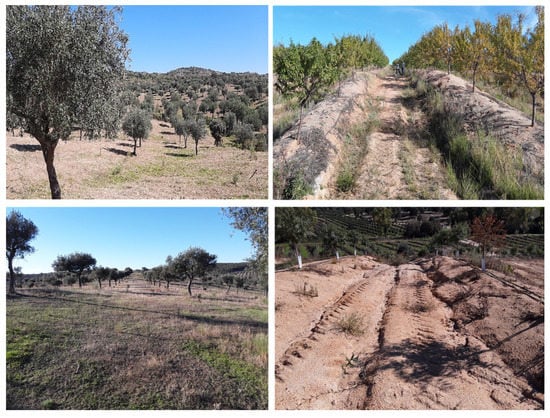 The study design aimed to obtain data to compare two different land use systems, one linked with traditional land use, based on traditional olive groves combined with pastureland, and the other involving intensive, irrigated almond orchards. The main characteristics of the selected land use systems are as follows:
