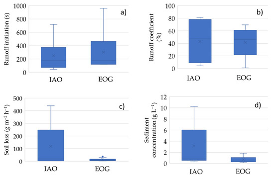 Comparative runoff initiation (a), runoff coefficient (b), soil loss (c), and sediment (d) concentration in the IAOs and EOGs.