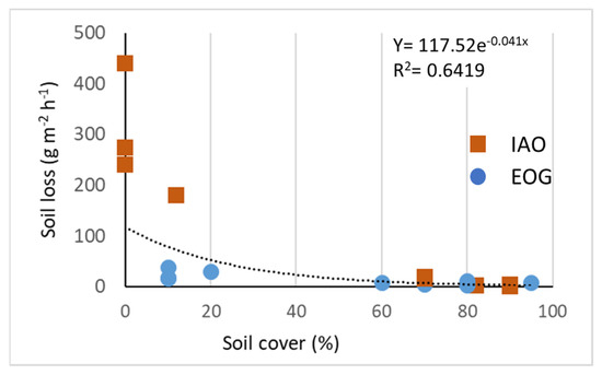 Consequently, for intensive soil use, the median value obtained at the end of the hot and dry summer for plots without any or with less than 10% of soil cover was around 280 g m−2 h−1, in contrast to plots with more than 70% of soil cover, with an average of 8 g m−2 h−1. For the EOGs, the values were 25 g m−2 h−1 and 5 g m−2 h−1 for plots with less than 10% and more than 70% of soil cover, respectively. These results, in line with other studies, confirm that maintaining vegetation cover is an important measure for the prevention and control of soil erosion, especially for IAOs, where enduring high percentages (>70%) of herbaceous or natural plant-residue mulch cover reduced soil loss by about 70%.