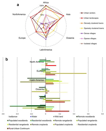 The higher the level of urbanization, the higher the degree of development of the natural land system. In continents with high levels of urbanization, such as North America, Asia, and Europe, there are higher proportions of residential cropland, rangeland, and woodland. In contrast, the proportion of uninhabited lands is higher in Oceania, Latin America, and Africa. Remote rangeland and woodland are the main parts, rather than residential areas. Africa has a very high proportion of sparse villages, resulting in a high proportion of its rural–urban continuum. Actually, most of the sparse villages in Africa are developed and utilized on bare land, whose development and utilization levels are only comparable to that of residential cropland and rangeland in other continents (Figure 2c).