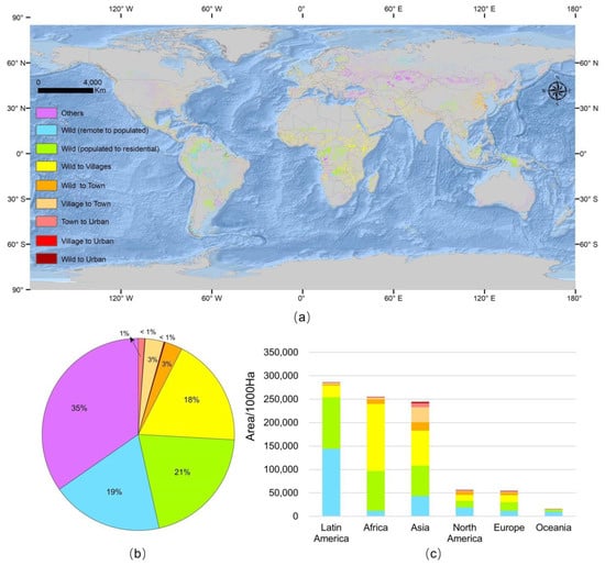 As vast and slowly developing continents, Latin America, Africa, and Asia were the top three continents with the largest change areas of land along the forward wild-rural–urban trajectory. Most of Africa’s wild area developed into villages over a 20-years interval while Latin America’s wildland recently became more intensely affected by human activities. Asia had the largest area of towns that developed from 2000 to 2020, especially towns developed from villages (Figure 4c).