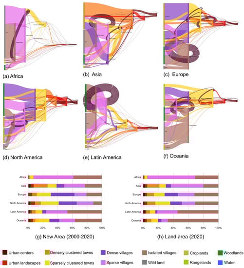 Sankey maps of human settlement development progress (2000–2020, (a): Africa, (b): Asia, (c): Europe, (d): North America, (e): Latin America, (f): Oceania) and percentages of new areas ((g), during 2000–2020) and percentages of areas in 2020 (h) occupied by each human settlement type in each continent.