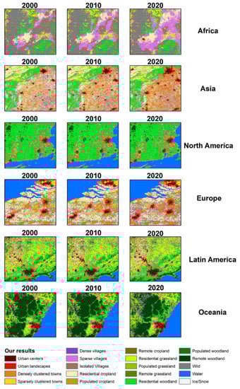 The concept of the rural–urban continuum and its extensive practice provide a new perspective for the study of urban areas and the urbanization process. In the classification results of remote sensing images, the data basis for a large number of analyses, the area mainly covered by impervious pixels is assigned to the built-up area, while the other areas are regarded as non-built-up areas []. There have been many studies that have estimated the distribution of urban areas around the world and the populations that live in them. It is estimated that about 2% of the terrestrial land can be characterized as urban [], and these urban areas contain more than half of the global population, which is expected to increase in the near future []. In addition, there is also an overall understanding of urban growth rates and regional differences. Gong et al. mapped global artificial impervious areas (GAIAs) and analyzed the trend of urban expansion in various countries and regions around the world []. Liu et al. analyzed global urban change from 1985 to 2015 and found that global urban extent has expanded at an unprecedented rate that is notably faster than that of population growth []. However, based on the perspective of the urban–rural continuum, urban areas are no longer just a single type, but a state of continuous development. From the perspective of the rural–urban continuum, the relationship between urban land expansion and population growth also needs to be viewed more carefully. It is also meaningful to understand the distribution, size, population, and historical trends of various types of human settlements from the rural–urban continuum perspective across the globe.