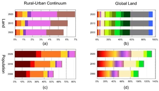 With the land-area expansion of the rural–urban continuum, more and more people live in the rural–urban continuum, especially in urban and peri-urban areas. In 2020, more than 60% of the world’s population lived on less than 7% of the land, and 86% of this population lived mainly in urban areas and towns (approximately 20% of the land area) (Figure 8a,c). In urban areas and towns, the growth rate of the land tends to increase every decade, and the growth rate of the population (30%) is even greater than that of the land (25%).